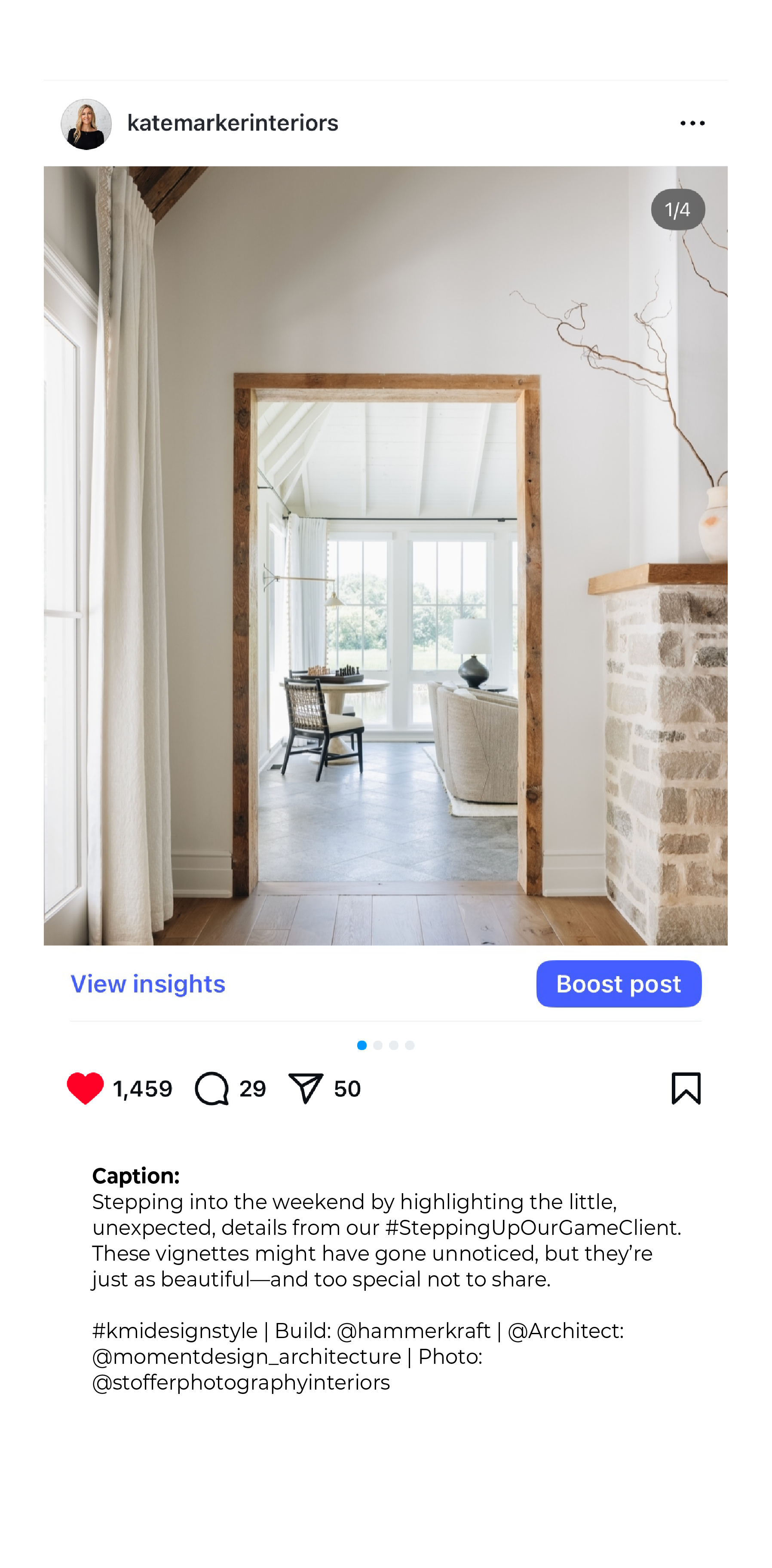 My goal was to create a fresh social media strategy for the Kate Marker Interiors account, with the aim of increasing engagement and brand awareness.